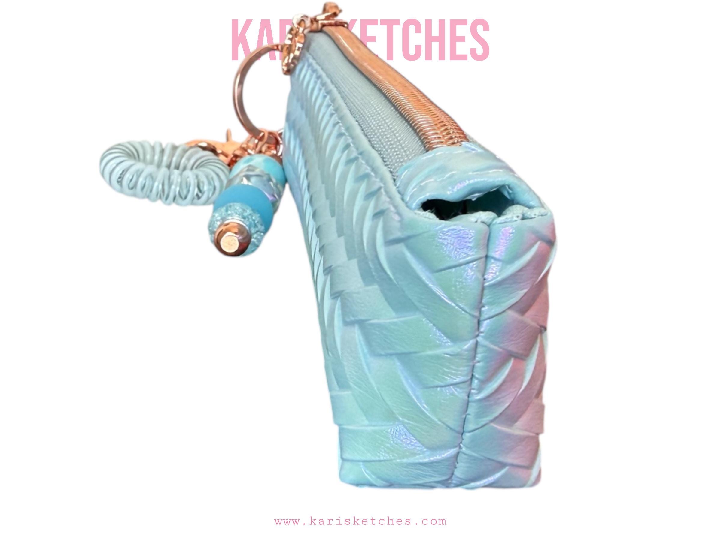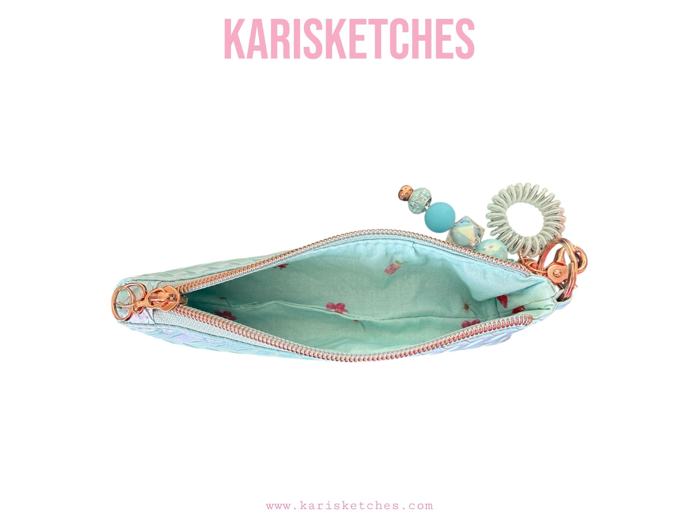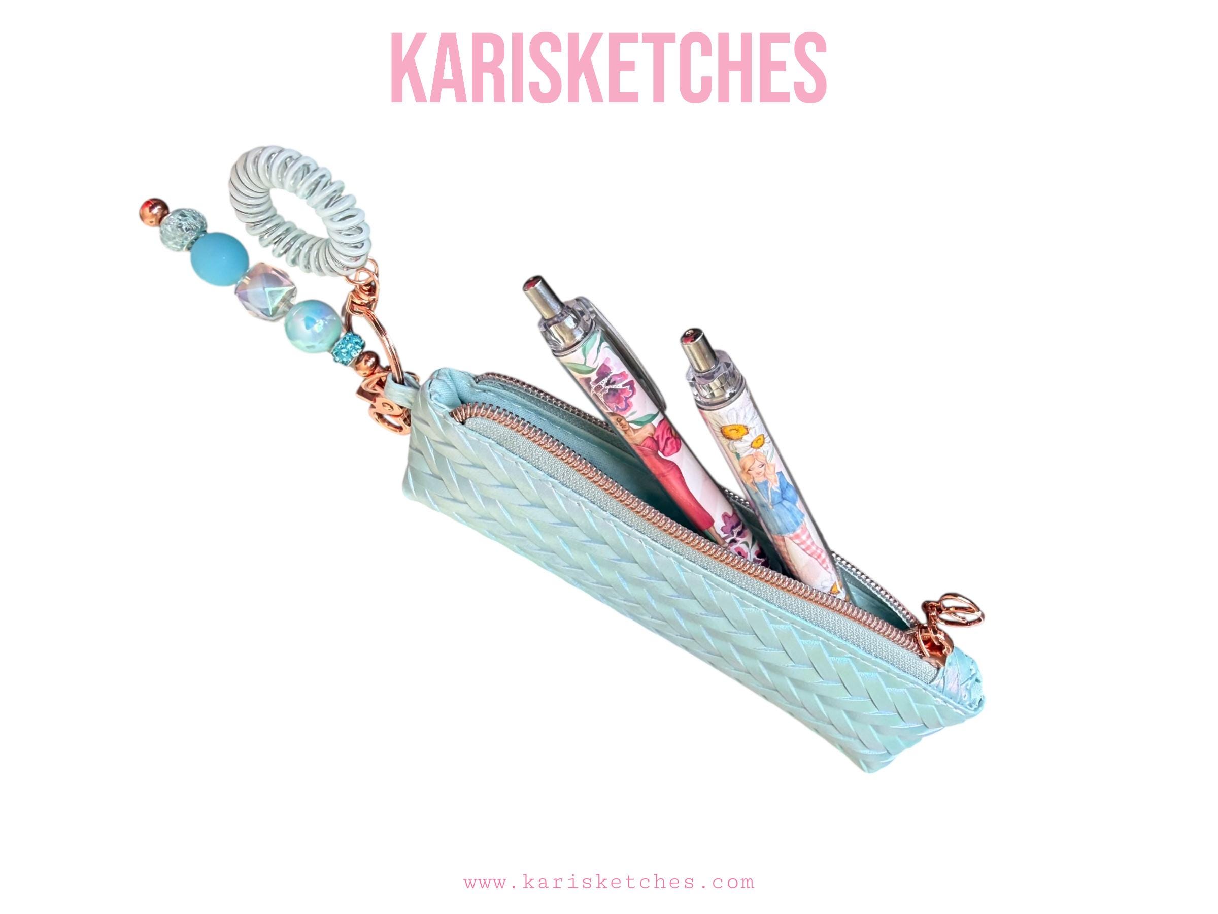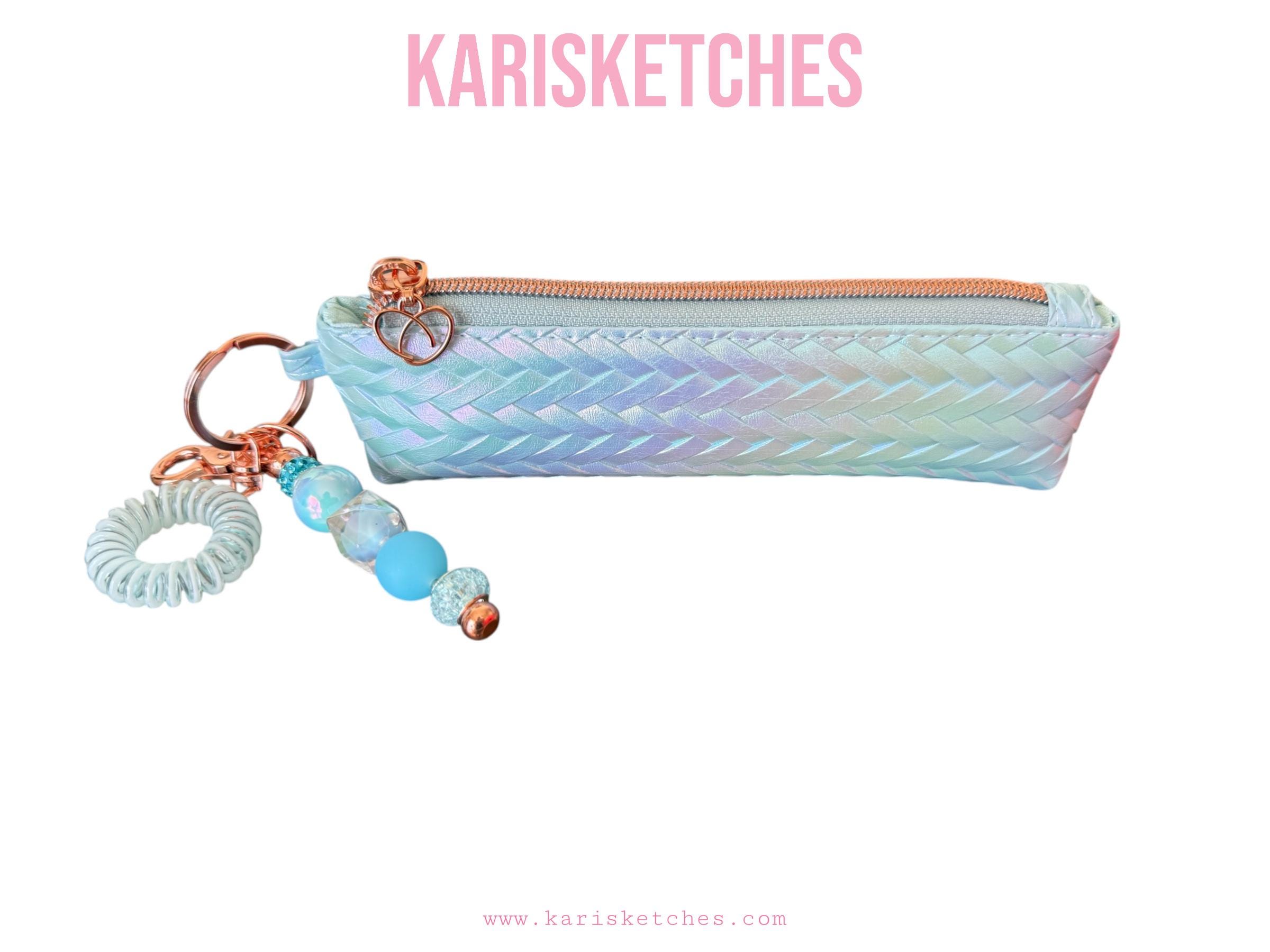 This is the cutest faux leather slim pen pouch. It’s narrow sleek look makes it a must have for all office fashionistas! Adorned with beautiful keychains and a clasp it fits approximately 3-6 pens or makeup brushes depending on width of utensils. It is lined with 100% cotton fabric containing KariSketches custom artwork. Get yours today!
