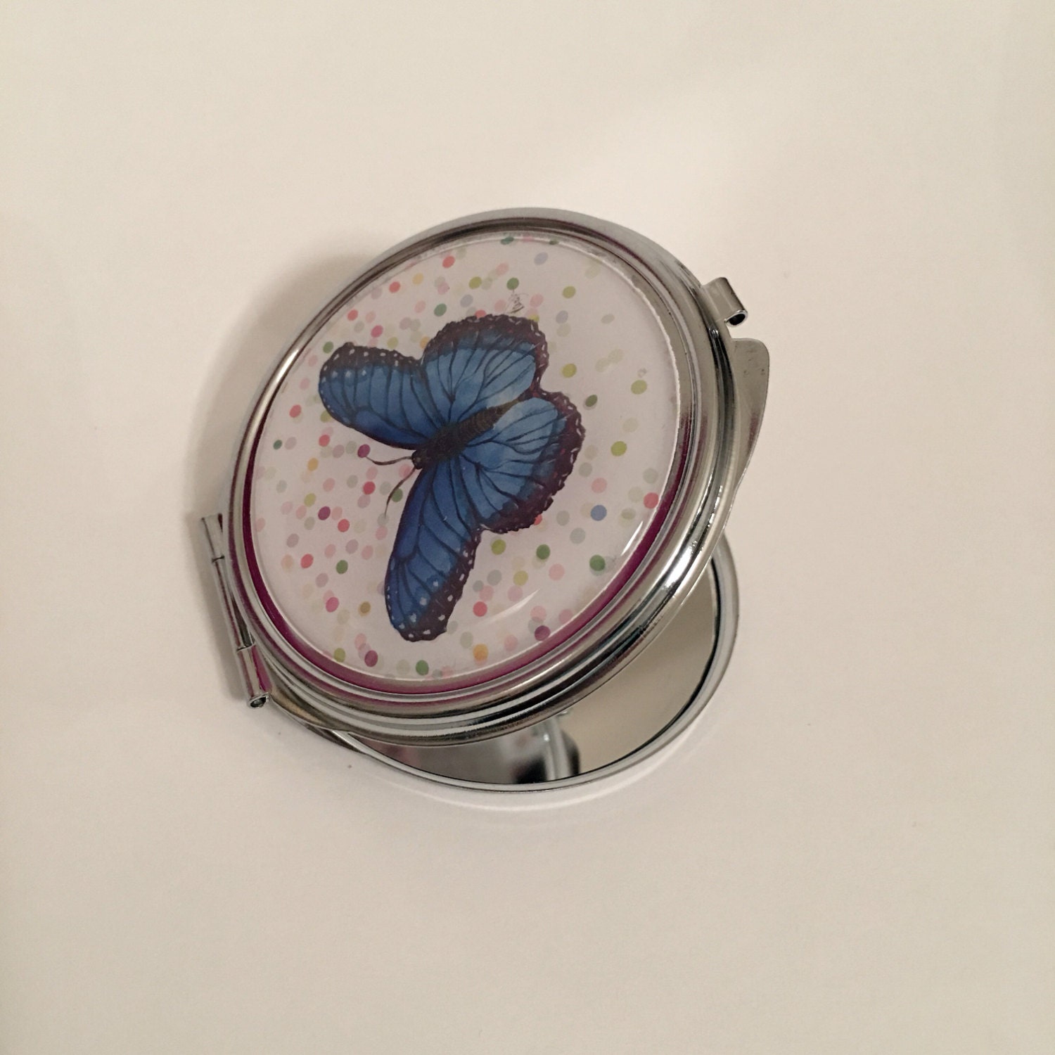 Blue butterfly metal round compact mirror.